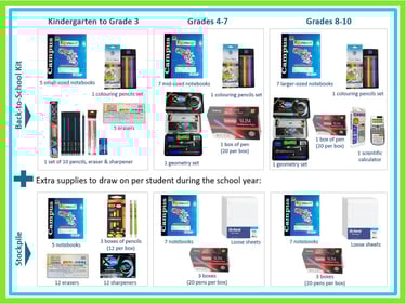 While supplies vary by grade level, every student receives a kit. This ensures consistency and reflects our commitment that no student is left without the essentials needed for class.