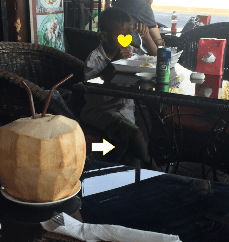 We were having breakfast in the patio in Cambodia’s capital, Phnom Penh. A kid was walking around asking patrons to buy candy. We waived him over, offered him to sit at the table next to us and asked the waiter to take his order.