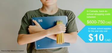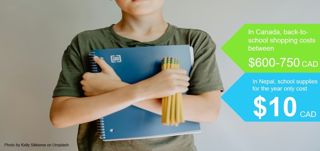 And here's another perspective: Similar school supplies cost nearly 8x more (before tax and shipping!) if purchased in Canada. We're conscious of the price disparity and have sourced a wholesaler in Nepal to help stretch the dollar so that $10 CAD can go a long way to helping the students in Nepal.