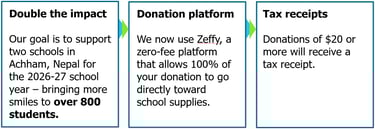 And most importantly, 100% of public donations will continue to go directly toward school supplies. The founders, Mark and Thai, will cover all other administrative costs.